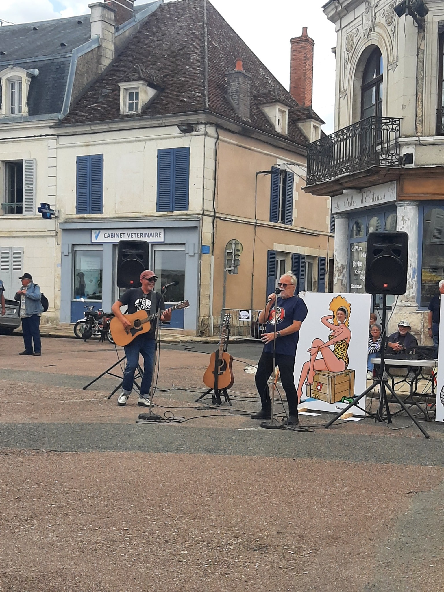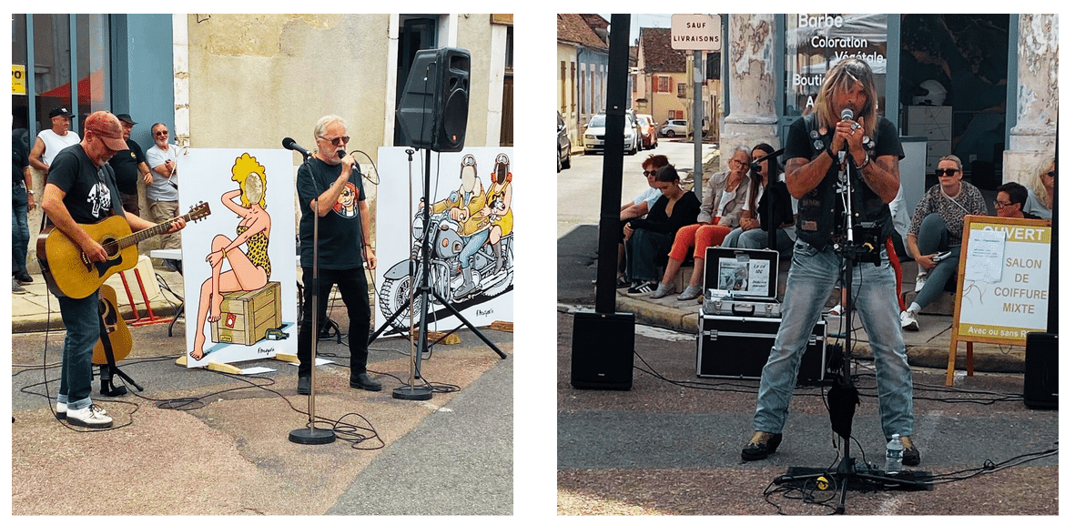 Dans le bourg du village, les nombreux visiteurs ont également pu profiter d’un marché vintage, d’une exposition de planches géantes sur l’œuvre de Margerin ainsi que de nombreuses animations imaginées et créées par les membres de l’asso ou d’autres habitants : un chamboule-tout, une superbe roue de la Fortune, un rallye photos et des silhouettes géantes (pour des photos hilarantes), auxquelles s’ajoute un tournoi de baby-foot. Motards et collectionneurs de voitures anciennes ont également exhibé leurs bolides, laissant des étoiles dans le regard des spectateurs.
